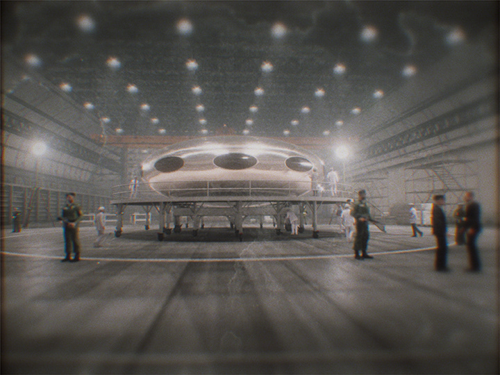 In December of 1963, a Top Marine Security Guard was given the assignment to go to an unknown U.S. Airbase in an unknown U.S. destination in which he spent 2 weeks or more securing a metal chrome-like, unknown origin saucer shaped spacecraft. Which was 40 feet in diameter sitting on top of aircraft scaffolding and locked up inside an air hangar with 24-hour surveillance by over 5-10 Special Forces and 4-5 Marine Security Guards, 25+ scientists, several major politicians, and upper echelons and chiefs of all 3 military branches, as well as the Secret Service and the Atomic Energy Commission. The UFO Craft was moved secretly to a new location after the 2 weeks and below is the depiction of his encounter.